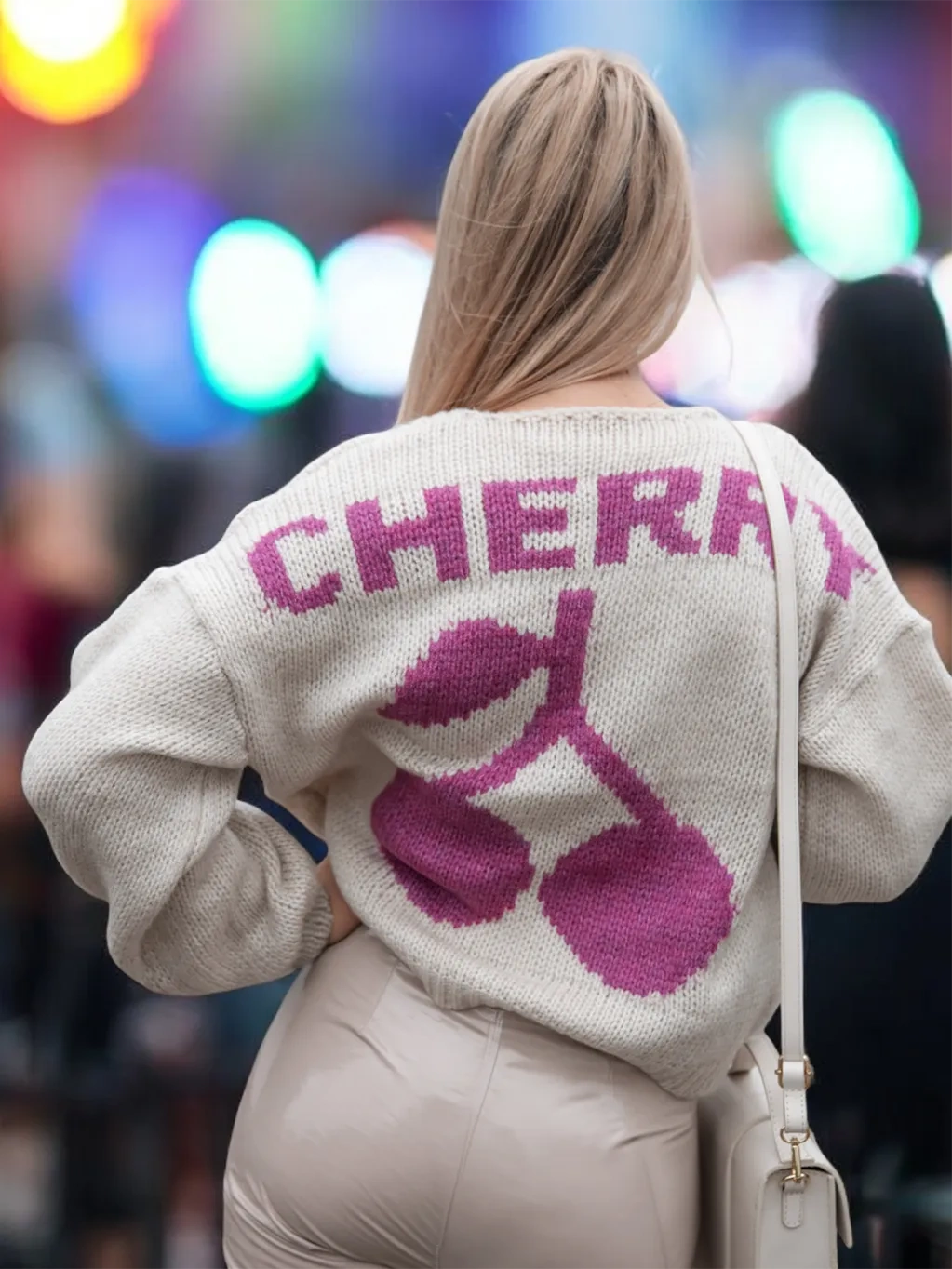 - A loose-fitting sweater tied at the front. The back features a large ‘CHERRY’ inscription and a cherry pattern. The sweater is perfect for cooler days.
