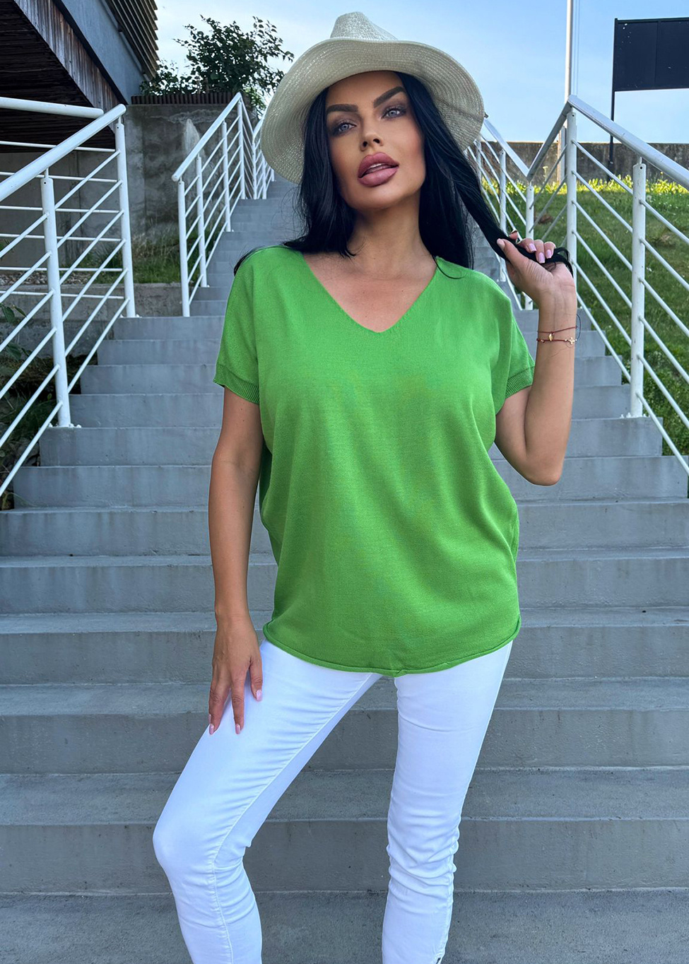 • Bluzka dzianinowa o kroju typu kimono w wersji oversize z szyją w serek z przodu i z tyłu, materiał bardzo przyjemny, idealny na wiosnę i lato.